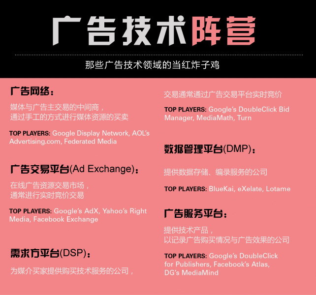00年代后期,媒介代理商發(fā)現(xiàn)了下一個利潤增長空間:通過內(nèi)部的受眾購買技術(shù)平臺服務(wù)廣告主,組建自有的互動廣告網(wǎng)絡(luò)和廣告交易平臺。為此,各大代理商通過各種途徑獲取相應(yīng)的技術(shù)支持。其中有一些收購了一些技術(shù)公司,但大部分代理商選擇使用由第三方技術(shù)供應(yīng)商提供的產(chǎn)品。