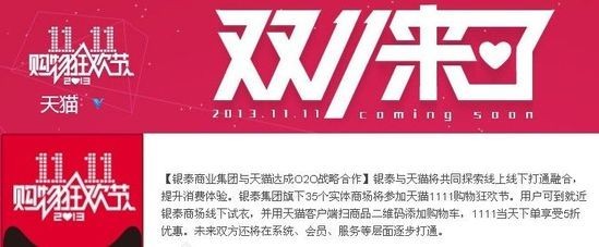 天貓與銀泰合體、貫通線上線下,在9月27日就放出了消息:"今年11月,銀泰商業(yè)擬與天貓開(kāi)展大型合作,這也許是一次中國(guó)最大的O2O規(guī)模,具體內(nèi)容還不便透露"。 10月17日上午,天貓?jiān)诠俜轿⒉┖藢?shí)了不便透露的內(nèi)容是:銀泰集團(tuán)旗下35個(gè)實(shí)體商場(chǎng)將參加天貓1111購(gòu)物狂歡節(jié)。